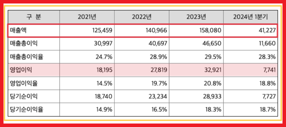 - 2023년: 매출액 1580억원, 영업이익 329억원