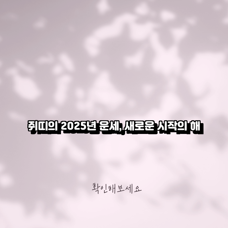 2025년은 쥐띠에게 새로운 시작과 변화의 해입니다. 이 시기를 잘 활용한다면, 자신의 삶에 큰 전환점을 맞이할 수 있을 것입니다. 긍정적인 마음가짐으로 다양한 기회를 잘 잡아가길 바랍니다. 쥐띠 여러분, 2025년에도 힘차게 나아가세요!
