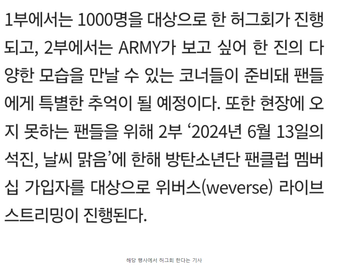 이벤트는 두 가지로 나뉘어요. 첫 번째는 '진's Greetings'으로, 1,000명을 대상으로 한 허그회가 열릴 예정이에요. 두 번째는 '2024년 6월 13일의 석진, 날씨 맑음'으로, 다양한 코너를 통해 진의 다양한 모습을 만나볼 수 있어요. 😊