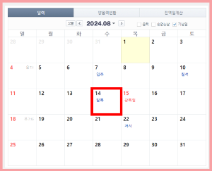 - 중복: 양력 7월 25일(목), 음력 6월 20일