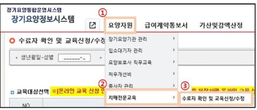 로그인을 마치고 나면, ‘요양자원’ 메뉴를 통해 ‘치매전문교육’을 선택하고 교육 신청/수정 페이지로 이동해요.