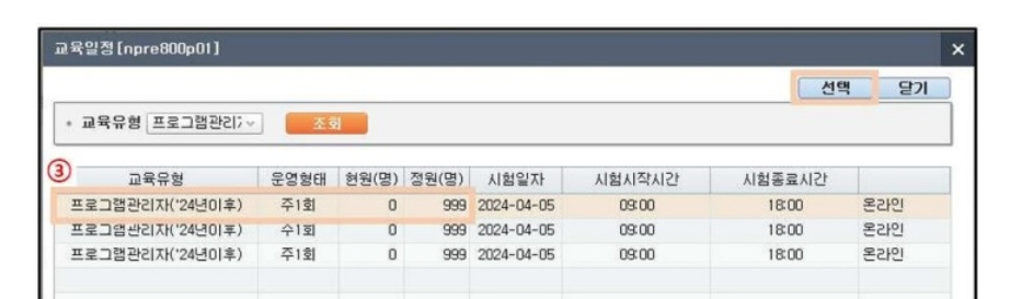 여기에서는 교육 유형을 선택하고, 교육 과정을 정할 수 있어요. 교육 신청 가능한 목록을 확인한 후 원하는 교육을 두 번 클릭하면 선택 버튼을 통해 신청을 완료할 수 있습니다.