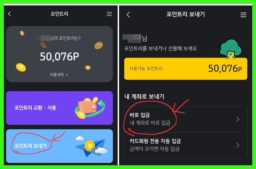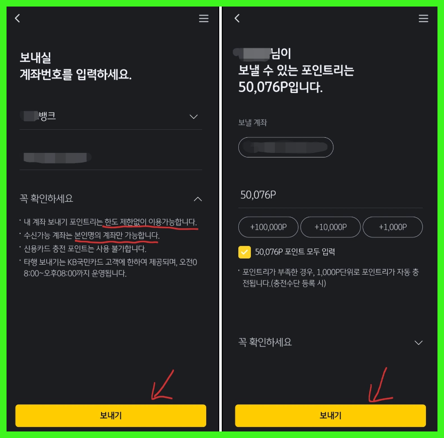 - 충전 완료: 충전이 완료되면, 충전된 KB 포인트리를 내 계좌로 송금할 수 있습니다.